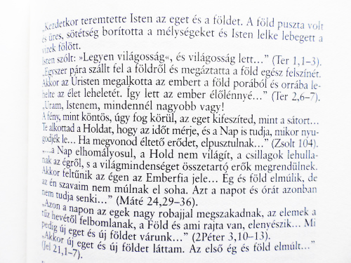 Teres Ágoston Biblia és asztronómia című könyvének 158-ik oldalán olvasható: „Idézzük most a világ eredetére és végére vonatkozó legfontosabb bibliai kijelentéseket, hogy legalább nagy vonásokban össze tudjuk hasonlítani a kozmológia újabb eredményeivel.” A következőkben leírtak első felében – pontosan első feléében – nem csak a hívő ember tudja felfedezni, a világ-természet-ember harmóniáját.